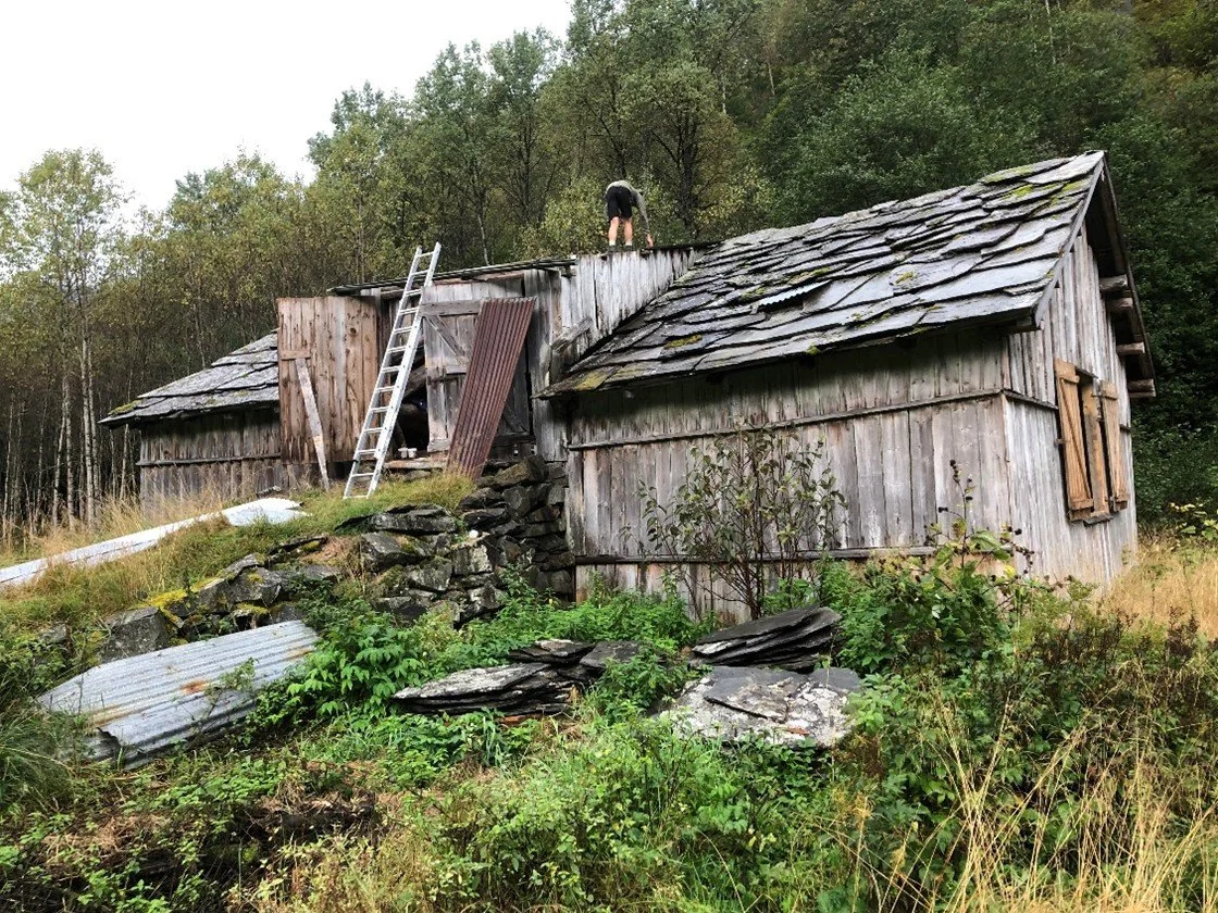 Dessutan har Simon Page plassert tre pallar med supplerande skiferheller frå stabburstaket på garden sin for seinare restaurering av taket her.